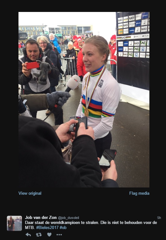 Maar nu? Ik las op mountainbike.be al het bericht dat ze volgend jaar voor een veldrit team kiest. Nog niet officeel bekend gemaakt, maar onze Belgskes zijn meestal redelijk goed op de hoogte. Gelukkig las ik ook dat het veldrijden gecombineerd zal gaan worden met het mountainbiken. Maar hoe lang blijft ze dat doen, en gaat de focus na een tijdje ( van succes) niet automatisch naar datgene toe waar je dan de prijzen binnen kan halen. En dan begint de offraodfanaat van Omroep Brabant ook nog te roepen: