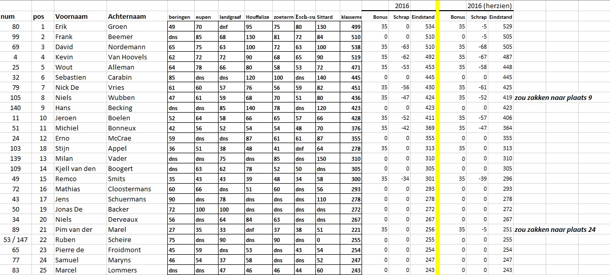 Wat het dus doet is Pim v/d Marel laten zakken naar plek 24 (raar, die gaat onder renners staan die niet alles gereden hebben (eigen keuze! en hij wel, maar 1xDNF (niet eigen keuze!) dus zakt hij onder bv Ruben Scheire. Werkt dus averechts. Je start alles, maar wordt “gestraft” omdat je 1x dnf hebt. Dan kan je dus beter 3x niet starten… ( ik chargeer…. ).