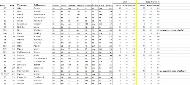 Goed, we gaan dus de bonus ook schrappen bij schrapresultaten. Heeft 0,0 effect, maar goed, we hebben weer iets om uit te zoeken. Onder de excel sheet van de elite mannen van 2016, met rechts de herziene telling na het (extra) schrappen van de startbonus.