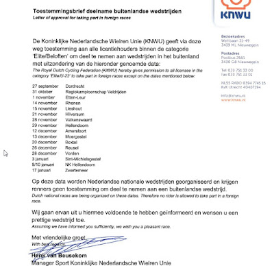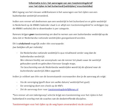 En de KNWU heeft die blijkbaar gevonden.  Gij zult niet vreemd gaan in het buitenland! Dus wedstrijden zoals Koppenberg, Asper Gavere en Spa franchorchamps ( dank Yannick Runhart) zijn bijvoorbeeld verboden terrein voor de nederlandse veldrijder die niet in de talentengroep zit of in de selectie. Cape Epic in maart? Denk t niet! Berlicum it is! Ook mooi en bijna hetzelfde!