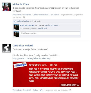 We me vandaag opviel, da vond ik wa verdacht. Ge kunt bij Cube elken dag wa winnen he, zo’n advent kalender, moete nummerke kiezen en dan doen ze da trekken en kijken ze wie er wint. Vandaag konde un reis winnen. Ook mooi, unne fietsvakantie ! Doek gerre mee, da begrepte wel.