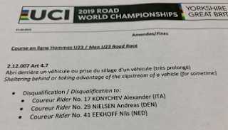 Tot een half uur na de race. Toen kwam het bericht dat de UCI Eekhoff had gediskwalificeerd wegens ongeoorloofd stayeren na een val eerder in de koers. Of dat terecht is laat ik even in het midden omdat de enige beelden die opduiken onderstaande zijn: